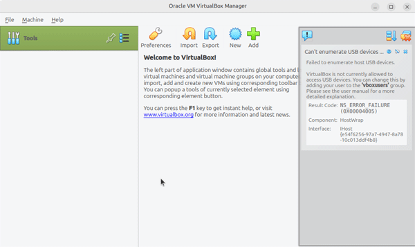 To resolve this issue you need to add yourself to the vboxusers group. Open the terminal and enter the following command. You will need to enter your root password.