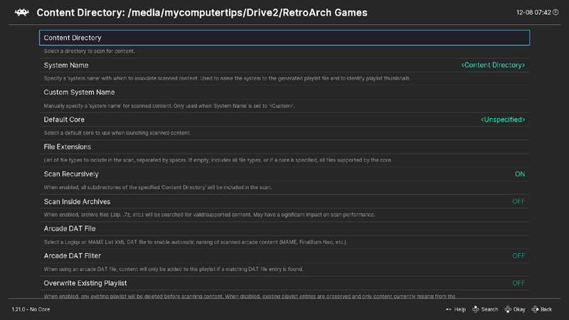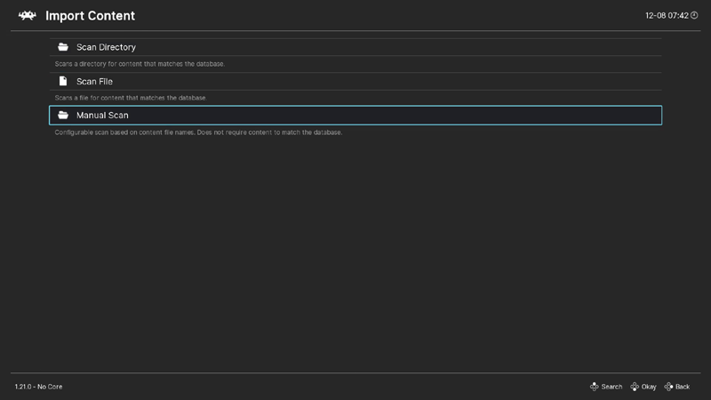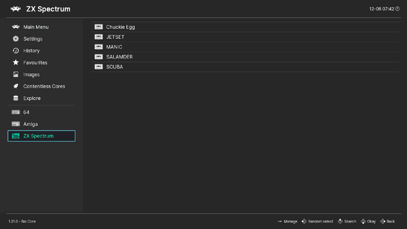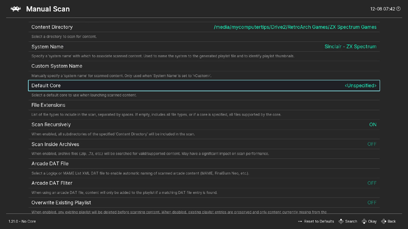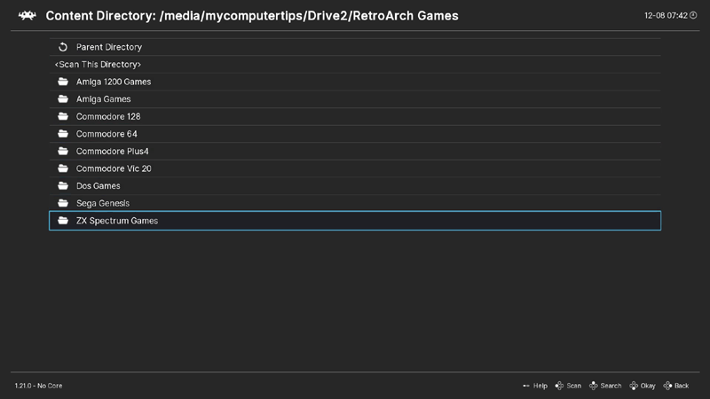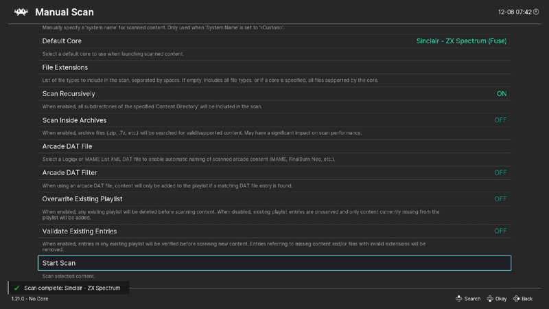 Retroarche's playlists feature is a great way to create shortcuts to your favourite retro games. This is achieved by scanning a directory of your games and then selecting the core the games will launch with. The example below sets up a playlist for ZX Spectrum games using the Sinclair - ZX Spectrum (Fuse) core.