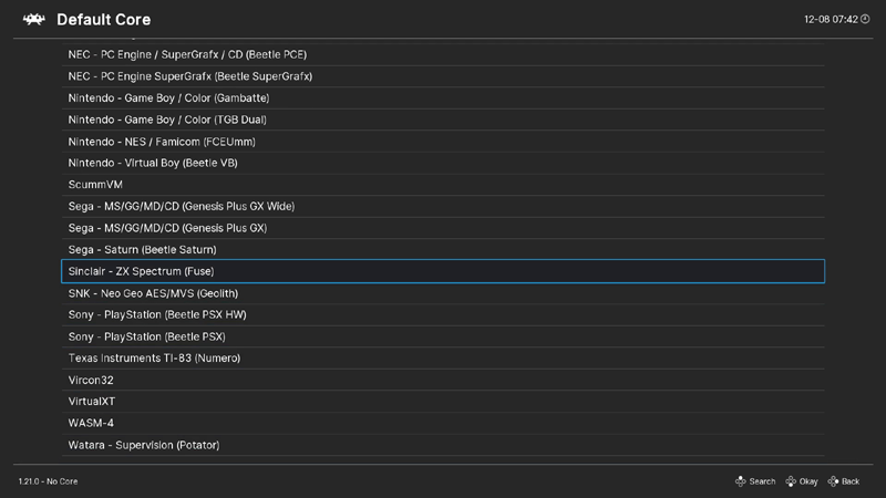 Step 9) Select the Default Core from the list, in my case Sinclair - ZX Spectrum (Fuse)