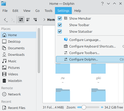Since there is no editable location bar in Dolphin, we first need to go in to the Dolphin settings to display it.